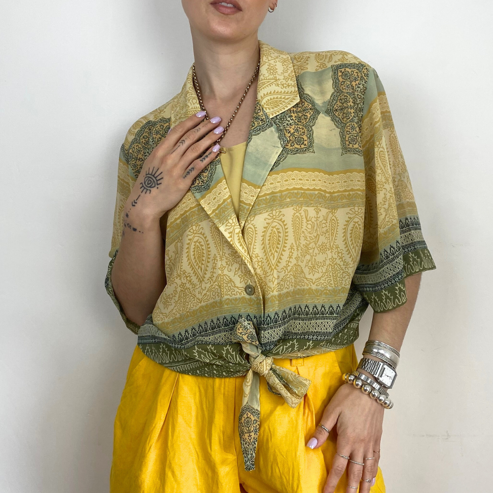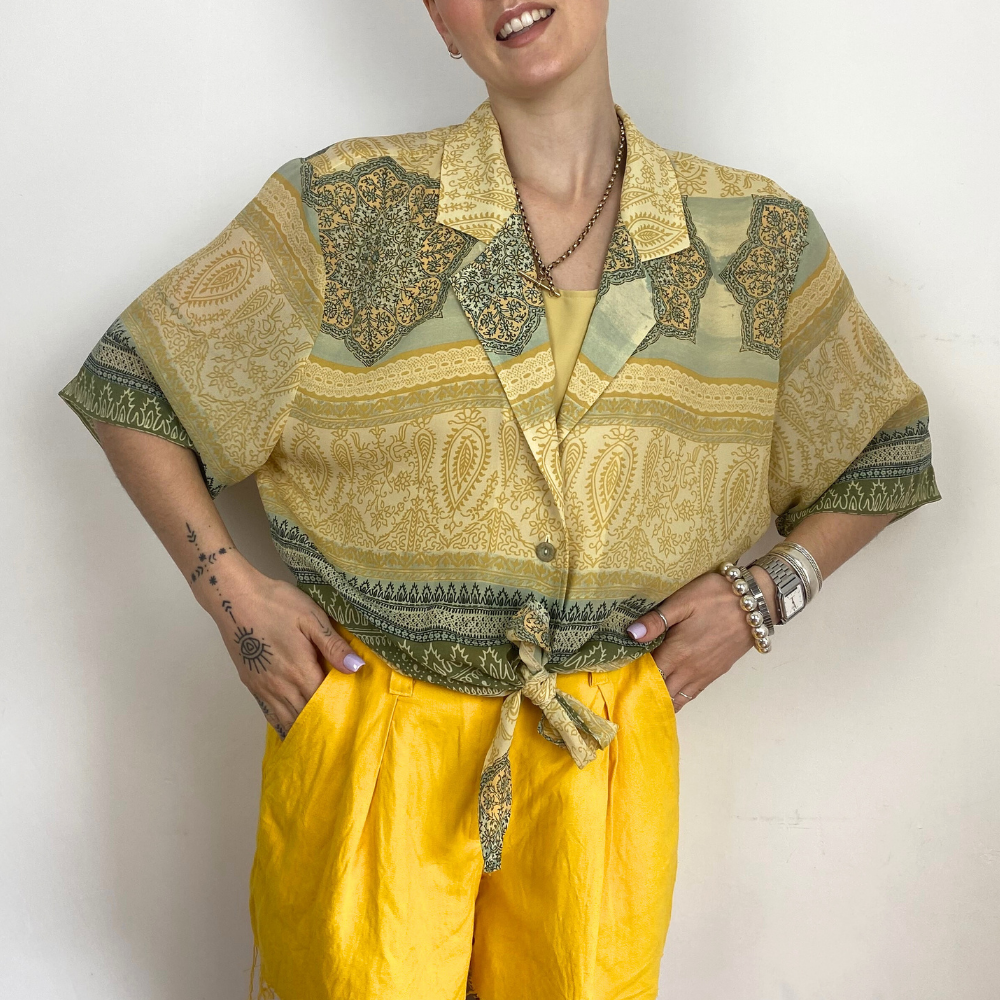 Hand selected vintage top options from online Irish Vintage brand And Again. Ethically sourced from around Europe. Carefully hand picked for their great quality, styling versatility & interesting details. Wide range of vintage tops in both casual & dressy styles; vibrant prints, solid colours, a big variety of styles & sizes.